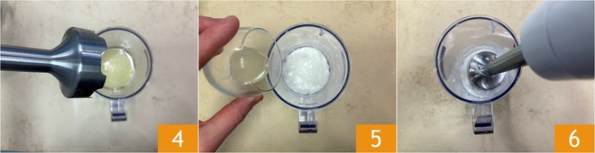 Coloque o mixer de imersão 4 e bata em velocidade média até que a mistura fique espessa. Nesse ponto, adicione o suco de limão 5 e bata novamente por alguns segundos 6.