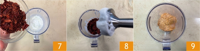 Adicione as pimentas cruscas trituradas 7, bata novamente para misturar 8 e reserve a maionese obtida 9.