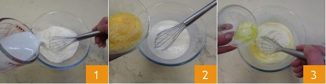 Para preparar os pacotinhos de alho-poró, salmão e robiola, comece preparando as crepes. Pegue a farinha e peneire-a em uma tigela. À farinha peneirada, adicione o leite em temperatura ambiente 1 e misture com um batedor até obter uma massa lisa e sem grumos. Agora pegue uma tigelinha à parte e bata os ovos com um garfo. Depois de bater os ovos, adicione-os ao restante dos ingredientes na tigela 2, misturando cuidadosamente com o batedor para obter uma mistura homogênea e cremosa 3.