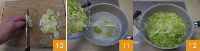 As folhas servirão para formar fitas com as quais fechar seus pacotinhos. Agora, fatie em rodelas finíssimas a parte branca do alho-poró 10. Em seguida, em uma panela aquecida com 20 g de óleo, adicione a parte branca dos alhos-porós finamente cortados 11 e deixe-os murchar em fogo baixo. Em seguida, adicione o leite 12.