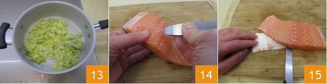 Enquanto a parte branca dos alhos-porós murcha, lave as folhas de tomilho e, depois de tirar do caule, pique-as finamente. Em seguida, adicione as folhas de tomilho finamente picadas aos alhos-porós que estão cozinhando e ajuste o sal e a pimenta. Cozinhe os alhos-porós por cerca de 15-20 minutos em panela coberta, mexendo de vez em quando para garantir um cozimento homogêneo 13. Neste ponto, pegue o salmão, tomando cuidado para remover todos os espinhos 14, se precisar, ajude-se com uma pinça. Retire a pele do seu filé de salmão 15.