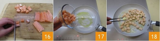 Corte o salmão primeiro em tiras horizontais e, em seguida, em pequenos cubos 16. Em uma panela aquecida, adicione um fio de óleo e depois doure um dente de alho, então coloque para cozinhar os cubinhos de salmão previamente cortados e cozinhe por 2-3 minutos 17. Ajuste neste ponto o sal e a pimenta e uma pitada de tomilho. Retire então o alho e reserve 18.