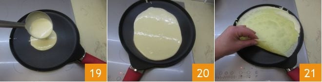 Depois do tempo necessário de pelo menos 30 minutos de resfriamento para a massa das crepes, aqueça uma frigideira para crepes ou, se não tiver, uma frigideira ampla antiaderente e unte-a com um pouco de manteiga; despeje no centro da frigideira uma concha de massa para crepes 19 e espalhe por toda a superfície da frigideira ajudando-se com o utensílio apropriado ou com o dorso da mesma concha 20. Cozinhe as crepes por um minuto movendo a frigideira de vez em quando ou ajudando-se com uma espátula para soltá-las do fundo, depois vire-as para cozinhar também do outro lado 21;