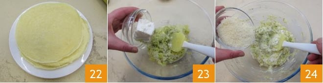 à medida que for fazendo as crepes, coloque uma sobre a outra em um prato de servir 22. Agora, pegue a mistura de alho-poró já morna e acrescente a robiola 23 e o Grana Padano 24.