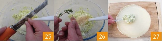 Em seguida, adicione a noz-moscada ralada 25, algumas folhas de tomilho 26 e misture bem tudo. Agora que todas as massas e preparações estão prontas, proceda com a preparação dos rolinhos. Pegue uma crepe e, depois de estendê-la sobre sua bancada de cozinha, adicione no centro 2 colheres de sopa da mistura de alho-poró 27.