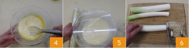 Em seguida, pegue 40 g de manteiga derretida e, depois de deixá-la esfriar um pouco, adicione-a à mistura 4, misturando tudo com um batedor para amalgamar bem todos os ingredientes. Coloque então a mistura na geladeira para descansar por pelo menos 30 minutos, coberta com filme plástico 5. Enquanto a massa para as crepes descansa na geladeira, proceda com a preparação do recheio dos rolinhos. Pegue os alhos-porós e limpe-os com a ajuda de uma faca 6.