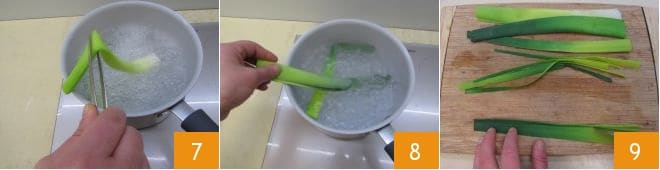 Agora, pegue as folhas mais verdes dos alhos-porós, escalfe-as em água fervente por 2 minutos 7 e depois escorra-as 8. Coloque as folhas de alho-poró assim escalfadas e coloque-as sobre uma tábua; depois, corte 6 tirinhas das folhas de alho-poró cortando cuidadosamente as próprias folhas seguindo o sentido horizontal da folha 9.