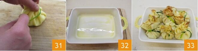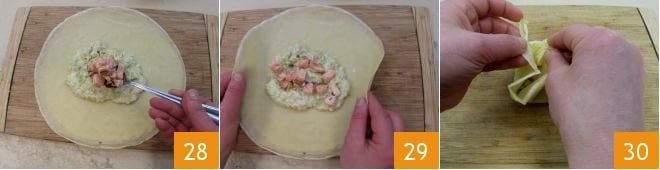 Em seguida, coloque também 5-6 cubinhos de salmão 28. Una então as bordas da crepe de modo a obter a típica forma de pacotinho 29, deixando o recheio fechado no centro 30.