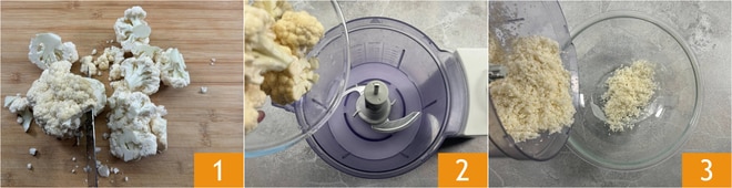 Para preparar a falsa pizza de couve-flor, primeiro retire as folhas e o talo da couve-flor, depois corte grosseiramente os floretes 1. Transfira-os para um processador de alimentos 2 e triture até obter uma textura semelhante ao cuscuz; despeje tudo em uma tigela 3.