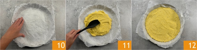 Amoleça o papel manteiga e forre uma forma de 30 cm de diâmetro 10. Despeje a mistura na forma e nivele com uma espátula 11 até obter uma espessura uniforme 12. Asse em forno estático, em contato direto com o fundo do forno, a 200°C por 10 minutos. Depois, mova a forma para a prateleira do meio e continue a assar por mais 30 minutos.
