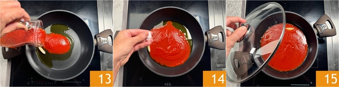 Enquanto isso, prepare o molho: em uma panela, coloque o óleo, adicione o alho com casca e refogue por alguns minutos. Adicione o purê de tomate 13, um pouco de água e ajuste o sal 14. Misture, depois cubra com uma tampa 15 e cozinhe em fogo baixo por 20-25 minutos.