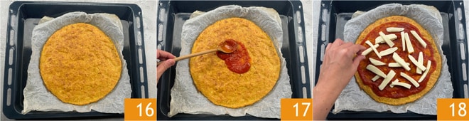Retire a base da pizza do forno e deslize-a, junto com o papel manteiga, para uma assadeira 16; dessa forma, ela não ficará mole devido à umidade. Distribua o molho 17 e a muçarela em tiras 18 sobre a superfície.