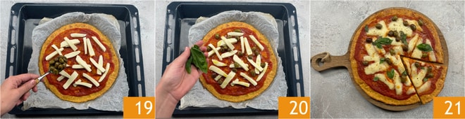 Adicione também as azeitonas 19, o manjericão 20 e uma pitada de pimenta. Asse no forno por mais 5 minutos, se necessário, prolongue o cozimento no modo grill por mais 2 minutos. Depois de retirar do forno, deixe descansar por alguns minutos. Sua falsa pizza de couve-flor está pronta para ser saboreada 21!