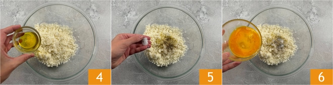 Adicione o óleo 4, o sal 5, a pimenta e os ovos 6.
