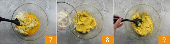 Misture os ingredientes 7, depois adicione a farinha 8 e misture novamente 9.