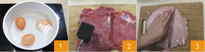 Para preparar o falsomagro, comece cozinhando os ovos em um panelinha cheia de água 1, depois pegue a fatia de carne bovina e bata bem com um amaciador de carne, para que a espessura fique uniforme 2. Corte a mortadela 3,