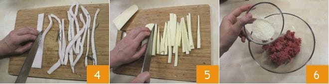 o toucinho 4 e o caciocavallo 5 em tiras de cerca de meio cm, depois reserve tudo. Em uma tigela grande, misture a carne moída, o queijo ralado 6
