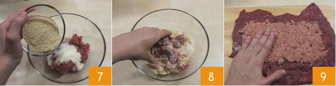 e o pão ralado 7, depois amasse bem com as mãos 8. Ajuste o sal e a pimenta, depois coloque a mistura sobre a fatia de carne bovina 9, cuidando para espalhá-la bem e deixar cerca de 2 cm de borda de cada lado, para evitar que o recheio escape quando a carne for enrolada.