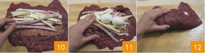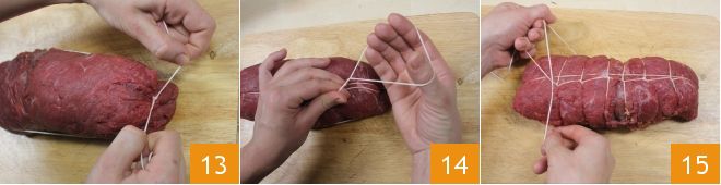 Feche o falsomagro enrolando a carne sobre si mesma; para selá-la, use um barbante de cozinha, como mostrado nas figuras (13-14-15) (para saber mais sobre como amarrar o assado clique aqui).