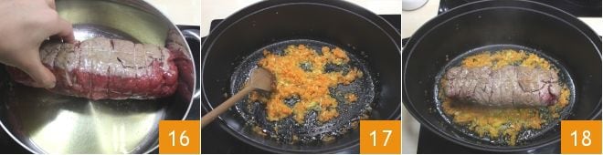 Doure a carne em uma panela com um pouco de óleo 16, cuidando para selá-la bem de todos os lados. Enquanto isso, prepare um picado de aipo, cebola e cenoura, e refogue-o em uma panela antiaderente com duas colheres de sopa de azeite de oliva, por alguns minutos em fogo baixo 17. Uma vez dourado o falsomagro, adicione-o ao refogado 18, continuando o cozimento em fogo médio;