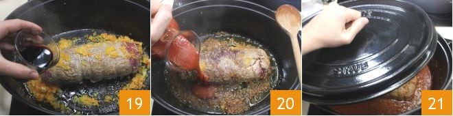após alguns minutos, adicione o vinho tinto 19. Em seguida, adicione o purê de tomate 20, uma colher de pasta de tomate triplo, sal e pimenta. Cubra com uma tampa 21 e deixe cozinhar o falsomagro, em fogo baixo, por 60 minutos, virando-o de vez em quando para cozinhar uniformemente. Passado esse tempo, verifique se o falsomagro está pronto espetando-o com um garfo: a carne deve estar macia.