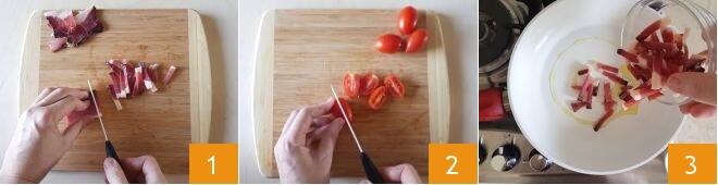 Para preparar as farfalle com creme de parmesão, speck e pistaches, comece cortando o speck em tiras de cerca de 0,5 cm 1; lave, seque e corte os tomatinhos em 8 partes 2. Em uma frigideira grande, coloque um fio de azeite, acrescente o speck 3 e deixe dourar por alguns instantes.