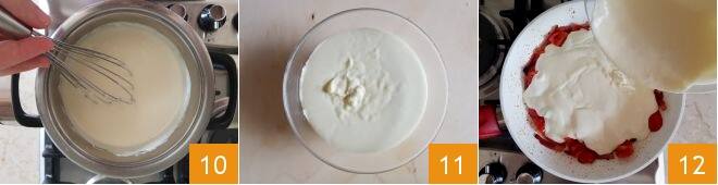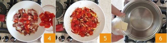 ajuste o sal e deixe engrossar em fogo médio-baixo, mexendo continuamente com o batedor (cerca de 5 minutos) 10; assim que a mistura estiver cremosa, desligue o fogo e acrescente o Parmesão ralado. Mexa bem para obter um creme liso e homogêneo 11. Adicione o creme de Parmesão ao speck e aos tomatinhos 12,