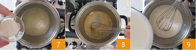 derreta em fogo bem baixo, adicione a farinha 7 e mexa com um batedor até obter um creme liso 8, acrescente o creme de leite 9,