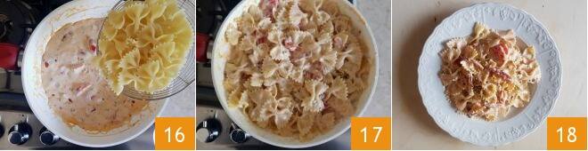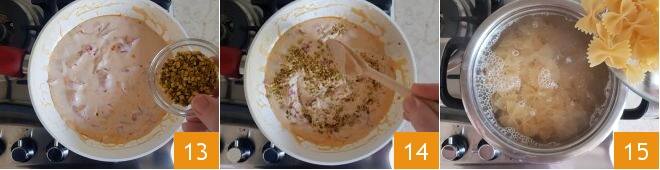 misture e acrescente a granola de pistaches (reserve 10 g para a decoração final do prato) 13, mexa novamente 14 e coloque de volta no fogo em chama bem baixa. Cozinhe as farfalle um minuto a menos do tempo indicado na embalagem 15