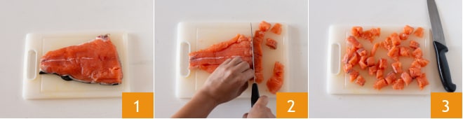 Para preparar as farfalle com salmão fresco, começamos pelo peixe. Coloque-o sobre a tábua de cortar seca 1 e com uma faca lisa e bem afiada, faça-a deslizar entre a pele e a polpa. Em seguida, corte em pedaços de 2-3 centímetros 2 e 3.