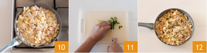 e continue cozinhando por mais alguns minutos, pois a massa deve estar cozida neste ponto: escorra-a no molho 10. Aumente o fogo, misture e adicione água, se necessário, caso o molho esteja muito seco. Pique um pouco de salsinha 11, despeje na panela e as farfalle com salmão fresco estão prontas, saboreie imediatamente 12!