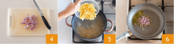 Agora limpe a cebola e pique-a finamente 4. Vá para o fogão e cozinhe as farfalle: mergulhe-as em água fervente e salgada, cozinhando-as de acordo com o tempo indicado na embalagem 5. Em uma panela, despeje o óleo e jogue a cebola: deixe-a dourar por alguns instantes 6