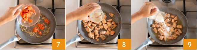 antes de adicionar o salmão 7. Cozinhe-o por 2-3 minutos, mexendo delicadamente e tomando cuidado para não secar demais. Neste ponto, regue com o vinho branco 8 e quando o álcool tiver evaporado, adicione o creme de leite 9