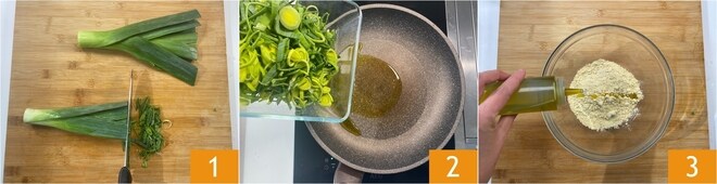 Para preparar a farinata de alho-poró, primeiro lave bem a parte verde do alho-poró e corte em fatias 1. Em uma frigideira, coloque um fio de óleo 2, adicione o alho-poró e cozinhe por cerca de 5 minutos, adicionando um pouco de água. Enquanto isso, prepare a farinata. Em uma tigela, coloque a farinha de grão-de-bico e 3 colheres de sopa de óleo 3.