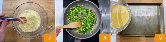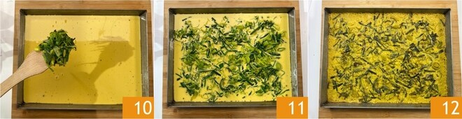 Você deve obter uma mistura sem grumos, bastante líquida 7. Neste ponto, o alho-poró estará bem salteado, desligue o fogo 8. Transfira a mistura para a farinata em uma assadeira 28x35 cm previamente untada 9, de forma a obter uma espessura de meio cm.