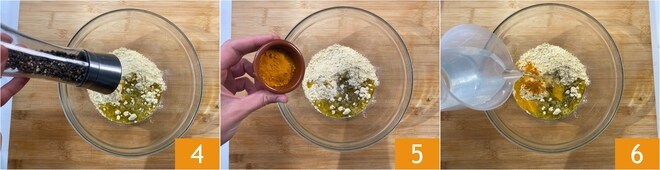 Adicione sal, pimenta 4 e meia colher de chá de cúrcuma 5. Adicione a água lentamente 6, mexendo com um batedor.