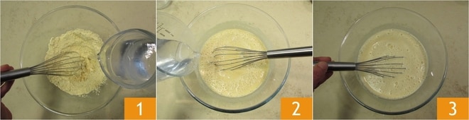 Para preparar a farinata de grão-de-bico com alcachofras, coloque em uma tigela a farinha de grão-de-bico e despeje no centro um pouco de água em temperatura ambiente 1. Misture bem, tomando cuidado para não formar grumos, e continue a adicionar a água 2 até obter uma mistura líquida e homogênea 3.