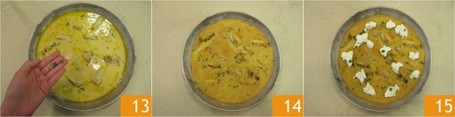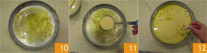 Unte 3 formas de 32 cm de diâmetro com bastante azeite extra virgem (a tradição prevê formas de cobre ou alumínio, mas você também pode usar uma simples forma antiaderente) 10, e com uma concha distribua a mistura de grão-de-bico 11. Considere que será necessário 1/3 para cada uma. Adicione as alcachofras em conserva previamente cortadas 12.