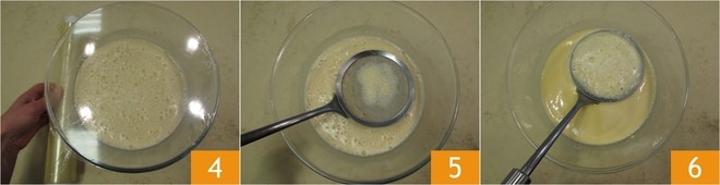 Cubra com filme plástico e deixe a mistura descansar fora da geladeira por no mínimo 5 horas e no máximo 10 horas, mexendo de vez em quando. Após o tempo necessário, note que uma espuma se formará na superfície: remova-a com uma escumadeira 5 até eliminá-la completamente 6.
