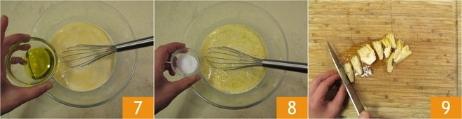 Adicione à mistura 20 g de óleo 7 e sal 8. Misture bem usando um batedor. Escorra bem as mini alcachofras e corte-as em fatias ou simplesmente ao meio, se não forem muito grandes 9.