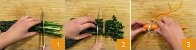Para preparar a farinata lucchese em cozimento no pote, comece preparando o caldo de legumes. Em seguida, lave e limpe todos os vegetais, elimine a parte dura do talo das folhas de couve 1 e corte as folhas em pedaços de cerca de 1,5-2 cm 2. Descasque as cenouras 3