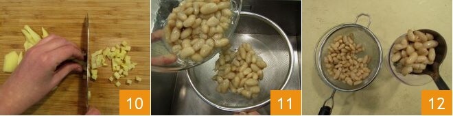 e depois cubos de cerca de 0,7 cm 10. Mantenha os vegetais de lado. Escorra os feijões do líquido de conservação 11 e retire metade para transferi-los para o copo de um mixer 12.