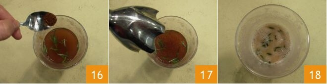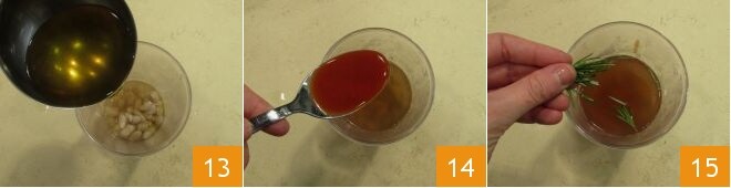 Adicione cerca de 4 conchas de caldo quente 13, 2 colheres de sopa de molho de tomate 14, algumas folhas de alecrim 15