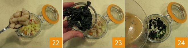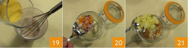 Adicione agora a farinha em chuva 19 e misture bem. Você pode montar os potinhos (use potes com fechamento hermético, novos e com anel de vedação): coloque em cada um um pouco de vegetais (aipo, cenoura, cebola) 20, alguns cubos de batata 21,