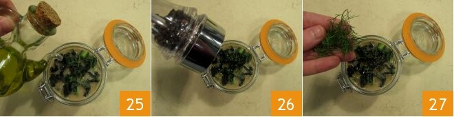 Complete com um fio de bom azeite 25, uma pitada de pimenta 26 e alguns raminhos de funcho selvagem 27.