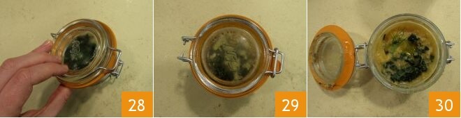 Feche hermeticamente os potes 28 e cozinhe no micro-ondas a 450 w por cerca de 5-7 minutos (depende do corte, do quão duros são os vegetais e do pote utilizado). Uma vez prontos, deixe-os descansar por um par de minutos 29, antes de abrir; para abrir, segure a tampa do potinho com uma mão e com a outra puxe a lingueta da vedação de borracha. Desfrute da farinata lucchese em cozimento no pote 30!