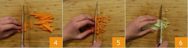 e corte-as em palitos 4 e depois em cubos de 0,5 cm 5. Proceda da mesma forma com o aipo 6.
