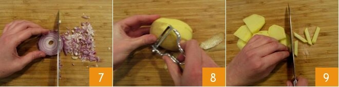 Em seguida, limpe e pique também a cebola roxa 7. Descasque as batatas 8, corte-as ao meio e de cada metade faça fatias, depois palitos 9