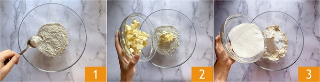 Para fazer a farofinha com creme trabalhe na tigela a farinha, o fermento em pó 1, a manteiga fria em pedaços 2, as sementes de uma fava de baunilha e o sal. Misture e esfarele até obter uma consistência arenosa. Em seguida, adicione o açúcar 3,