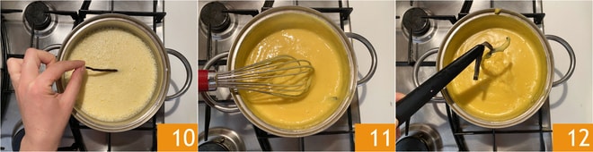 Adicione a fava de baunilha restante da massa 10 e cozinhe o creme em fogo baixo, mexendo com um batedor por 6-7 minutos 11. Quando o creme estiver firme, desligue o fogo e retire a fava de baunilha 12. Deixe o creme esfriar.